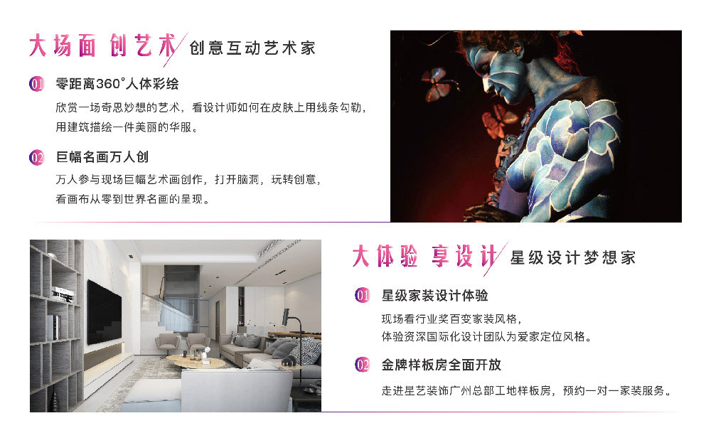 2018年1月6日在廣州白云區五號停機坪購物廣場舉行盛大落地活動,到場客戶可欣賞人體彩繪,參與巨幅名畫創作,好禮與樂趣并行?;顒蝇F場不止有豐富互動,到場咨詢客戶還可獲得精美禮品一份。活動現場資深設計師云集,一對一專業咨詢,體驗優質的家裝服務。