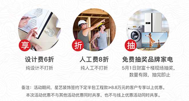 在這裝修的最好時節(jié),星藝裝飾開啟裝修狂歡季,帶來了多重優(yōu)惠豪禮。設(shè)計費6折,人工8折,活動現(xiàn)場可參與砸金蛋抽取品牌家電,100%中獎,。從設(shè)計到施工,您要的優(yōu)惠,盡數(shù)奉上。