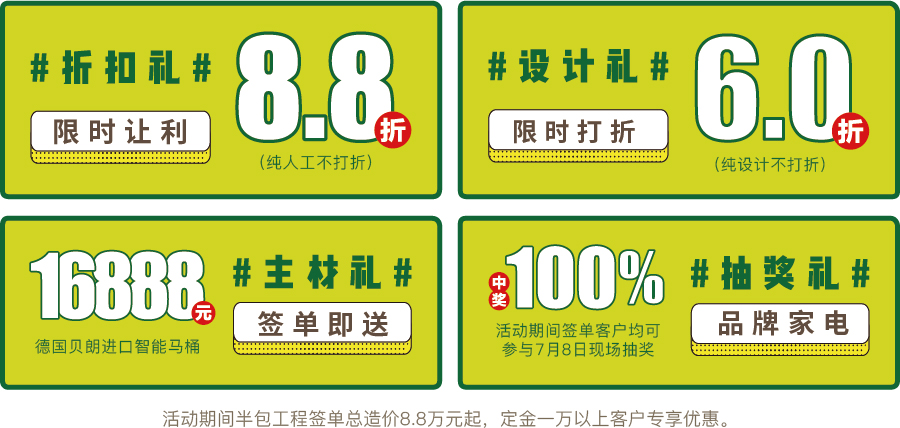 活動期間(6月17日-7月8日),簽單下定業(yè)主可享受設(shè)計(jì)費(fèi)6折,人工8.8折簽單優(yōu)惠,還可獲贈價值16888元德國進(jìn)口貝朗智能馬桶一個,7月8日可到財(cái)富廣場東塔參與品牌家電抽獎,百分百有獎,數(shù)量有限,抽完即止。