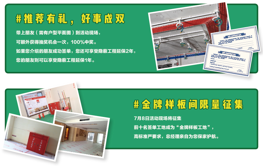 與好伙伴同享好禮,就是節(jié)日的意義。那么,這次驚喜大禮怎能不告訴你身邊的小伙伴呢。推薦好友成功簽單,豪禮翻倍。7月8日活動現(xiàn)場推薦好友成功簽單,您 即可享受隱蔽工程延保2年,您的朋友 也能享受隱蔽工程延保1年。好品質(zhì),值得分享。