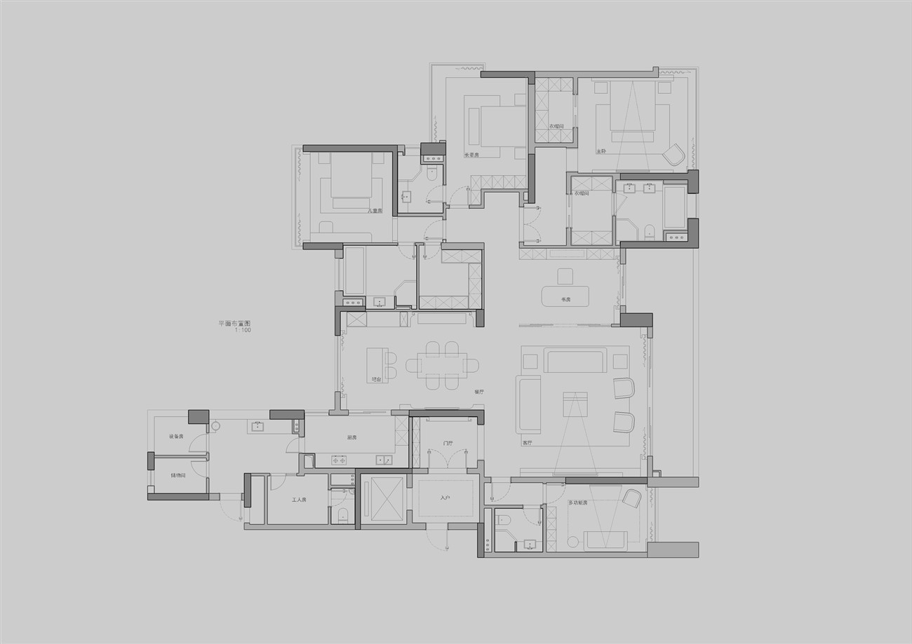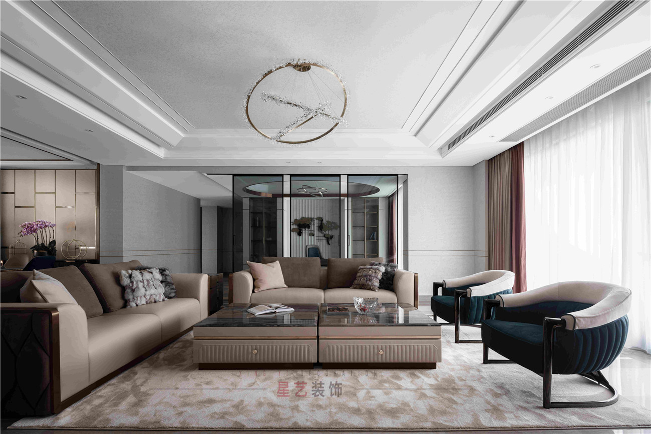 本案設計是位于海珠區380㎡的住宅,擁有無敵景觀一視野,業主90后,準備做婚房,要求輕奢,鐘愛石材,金屬和皮質的家居風格,敞開式書房通過隔斷可移動屏風于客戶區域串聯起來,可開可隔斷的靈動組合,最大的強化空間包容及開闊性,用中西結合的方式為即將到來的婚姻生活帶來更高的幸福指數,打造溫馨的生活環境。