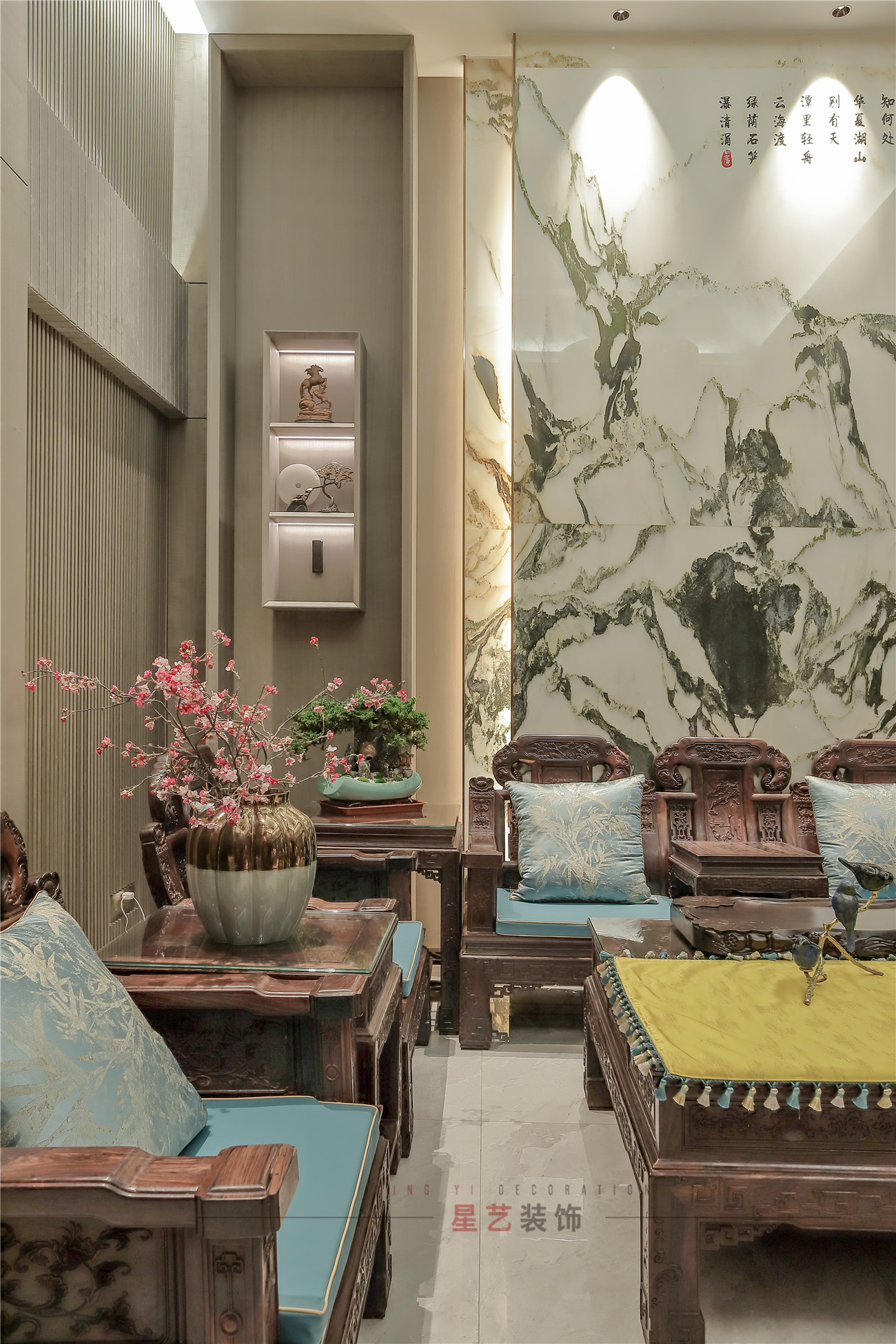 客廳采用古色古香的紅木家具,雕刻不繁復(fù),顏色不沉悶,整體端莊大氣,沉穩(wěn)時(shí)尚。尤其是水墨紋路的大理石墻面,提煉出古典元素的精髓,綠盆景更是讓整個(gè)設(shè)計(jì)提升了清幽雅致的風(fēng)水畫(huà)格調(diào)。