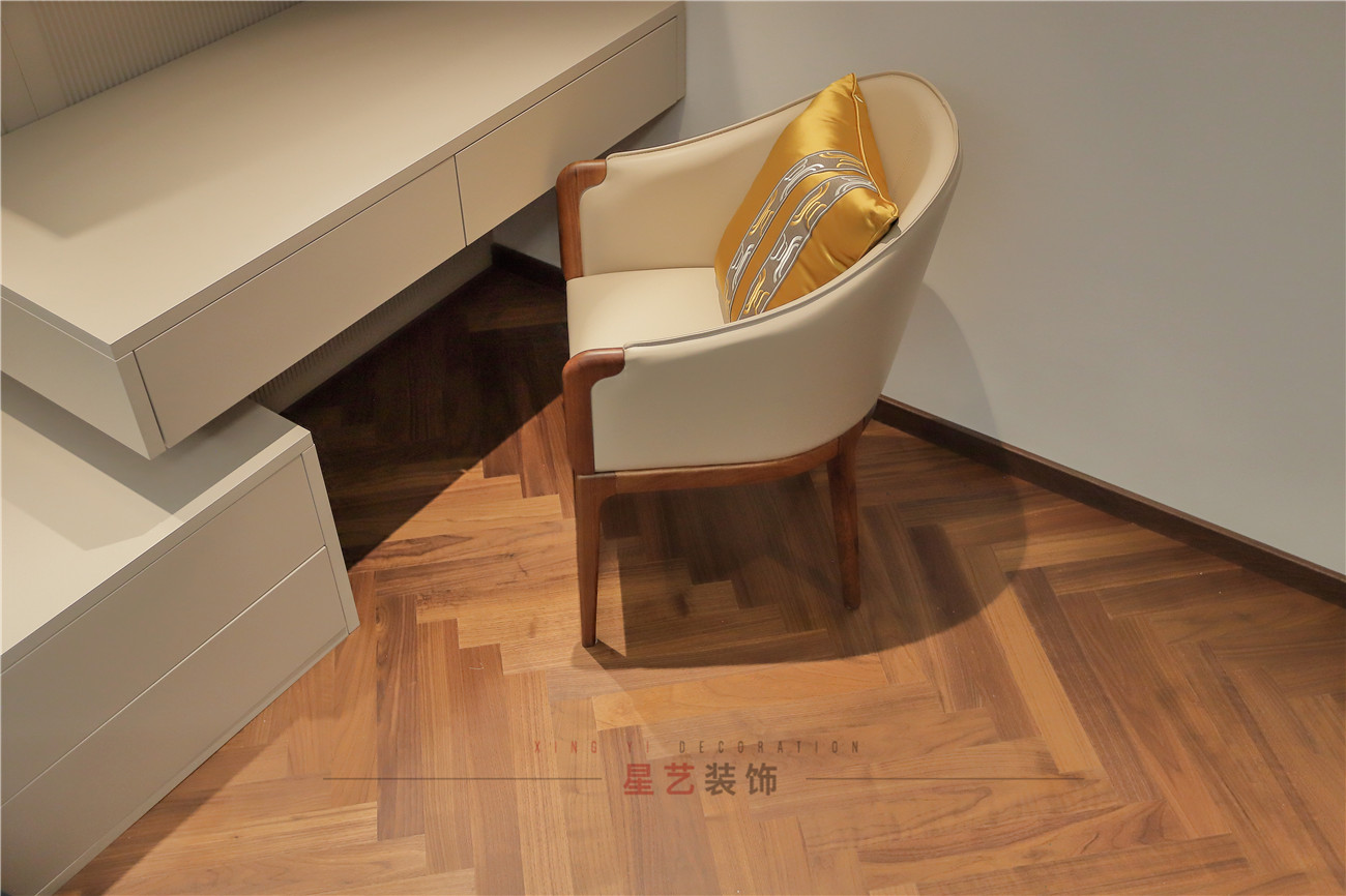 臥室用豐富的色彩搭配營(yíng)造了一個(gè)溫馨舒適的環(huán)境,若隱若現(xiàn)的山水背景墻和枝椏圖案仿佛處在春意盎然的環(huán)境中,感受自然的勃勃生機(jī)。旁邊就可以作為化妝間,屬于愛(ài)美女性的小天地。