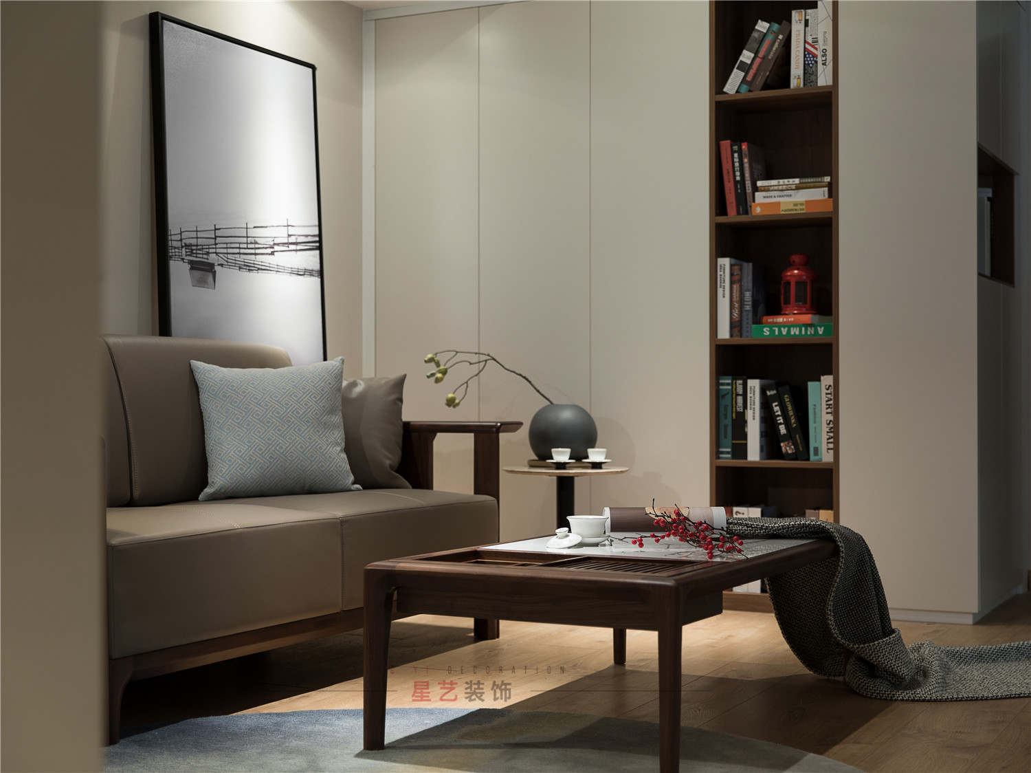 業主平常非常喜歡看書,提高自身修養,所以設計師特地在兩邊床頭位置設置了小書柜,回家后也可以在窗邊的藤椅上休息,看太陽落山,日暮降臨,沉浸在自己的小世界里,以最好的狀態迎接每一天。