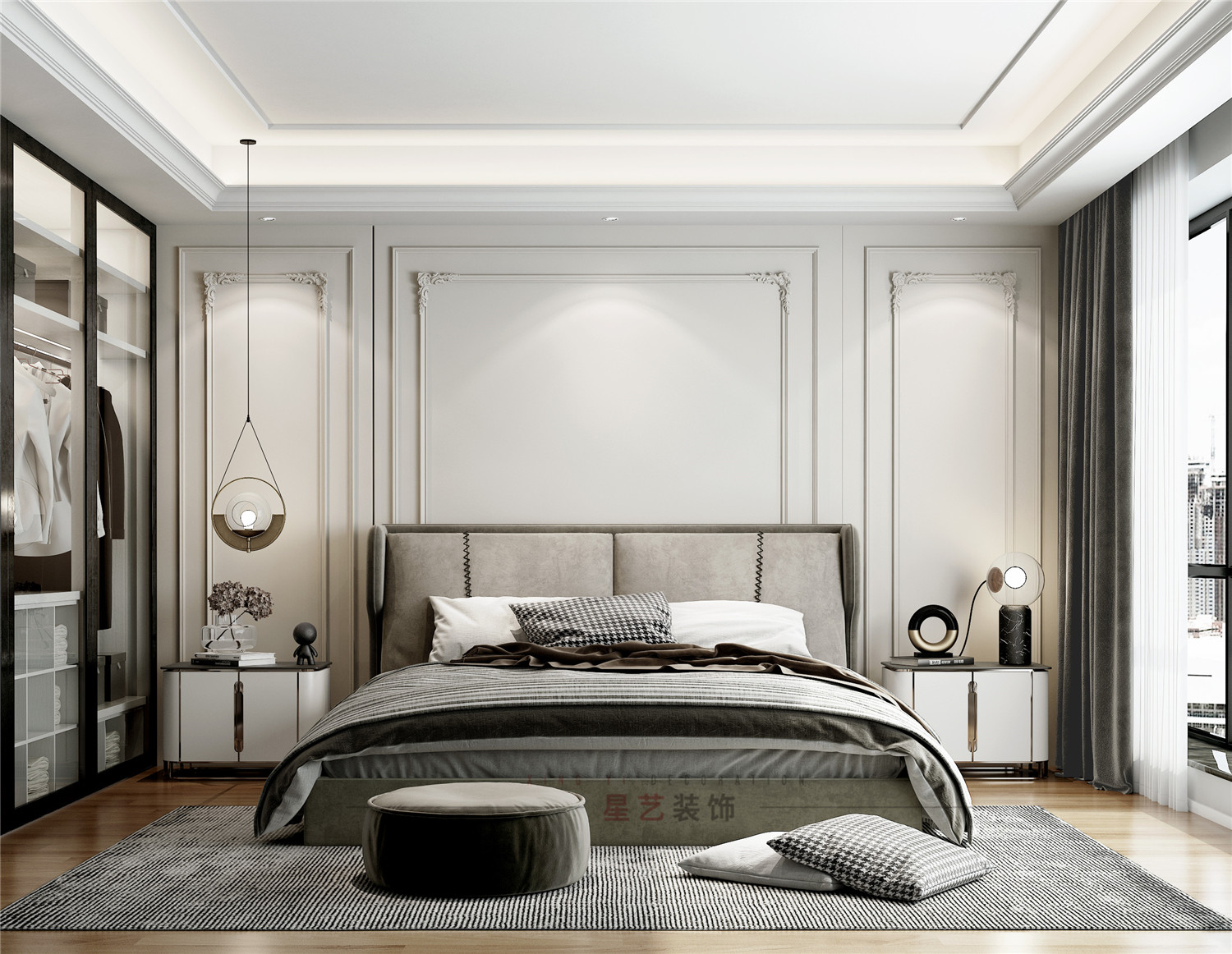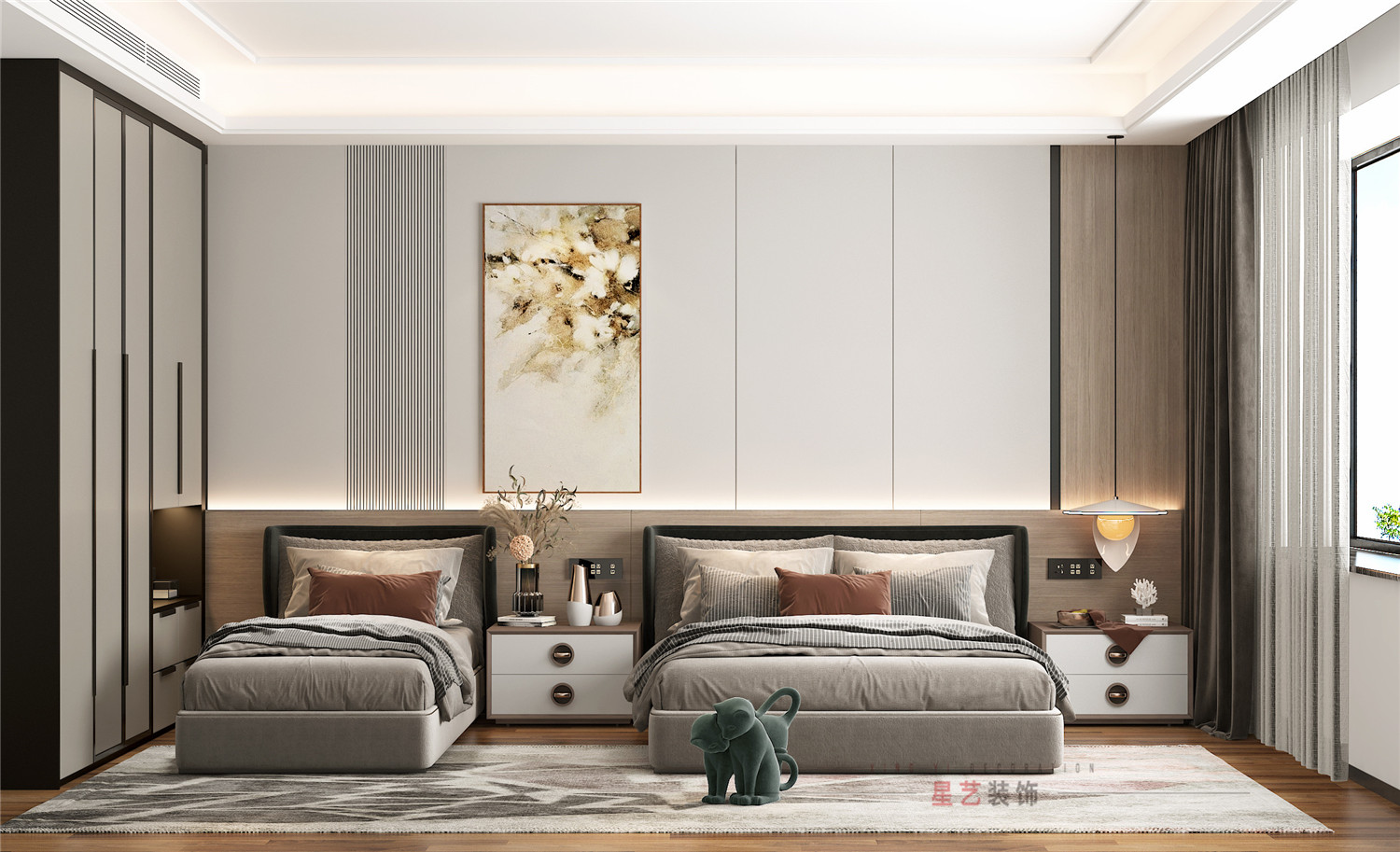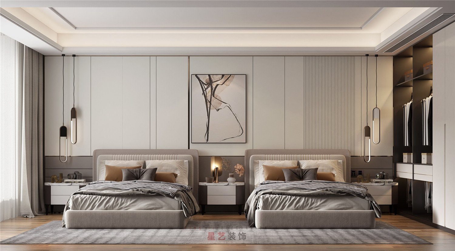 主臥用大面積灰調(diào)與對(duì)稱的設(shè)計(jì),沉穩(wěn)高級(jí)。簡(jiǎn)約之中,又有無(wú)盡的雅致與濃厚的生活氣息。