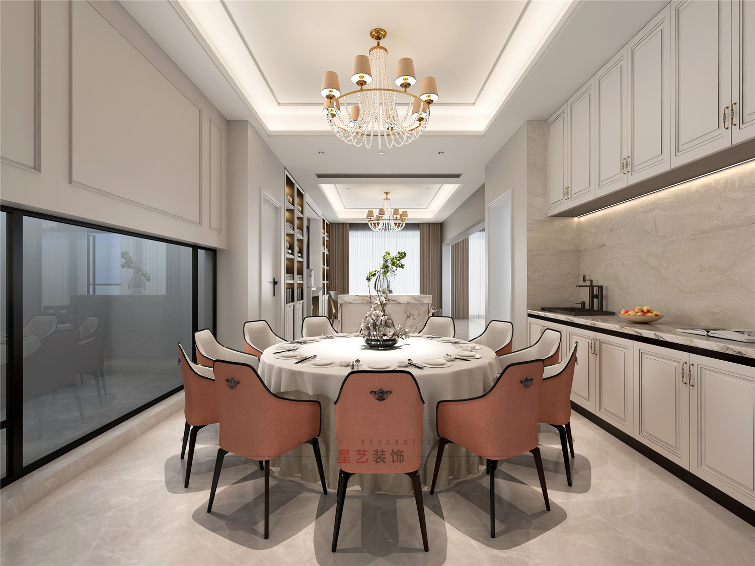 宴席區(qū)與工作區(qū)相連,也是業(yè)主讀書會(huì)客的重要場(chǎng)所,整體空間層次豐富,動(dòng)線流暢,大理石臺(tái)面搭配白色櫥柜,簡(jiǎn)約耐看