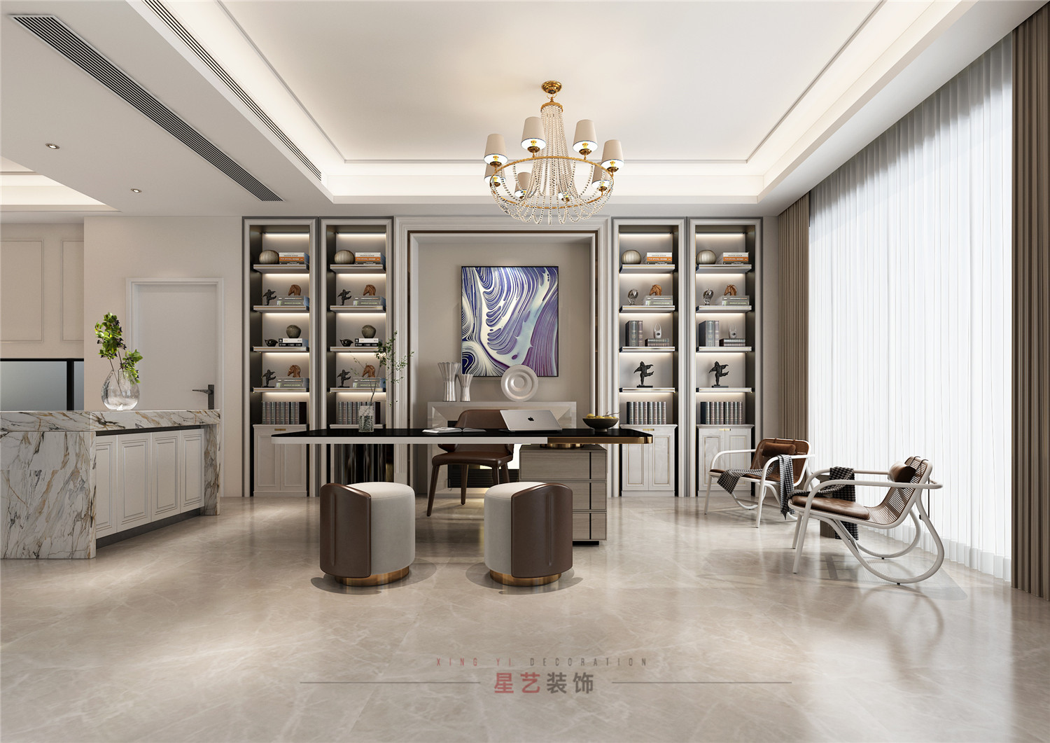 工作區(qū)靠近落地窗,光線充足。挖空墻面設(shè)計(jì)置物架,縮減空間又更加整體,并且端景的設(shè)計(jì)極具輕奢風(fēng)格。