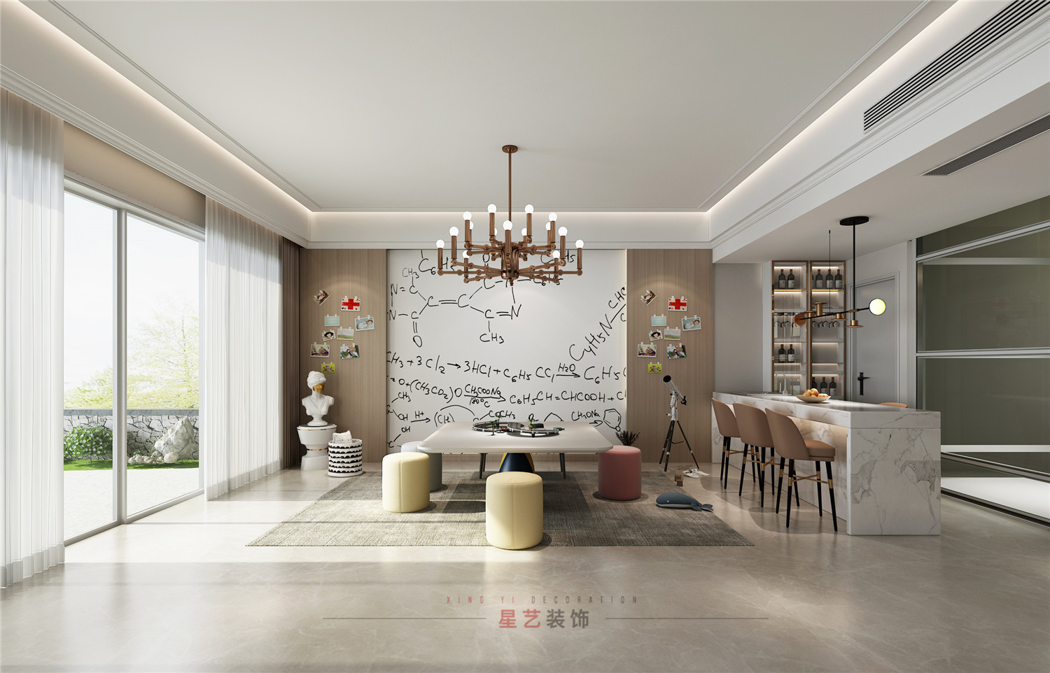 從小培養(yǎng)興趣愛好是非常重要的,小孩的活動(dòng)區(qū)中用化學(xué)公式為背景,設(shè)置望遠(yuǎn)鏡,積木等器材,讓孩子能多方面發(fā)展。