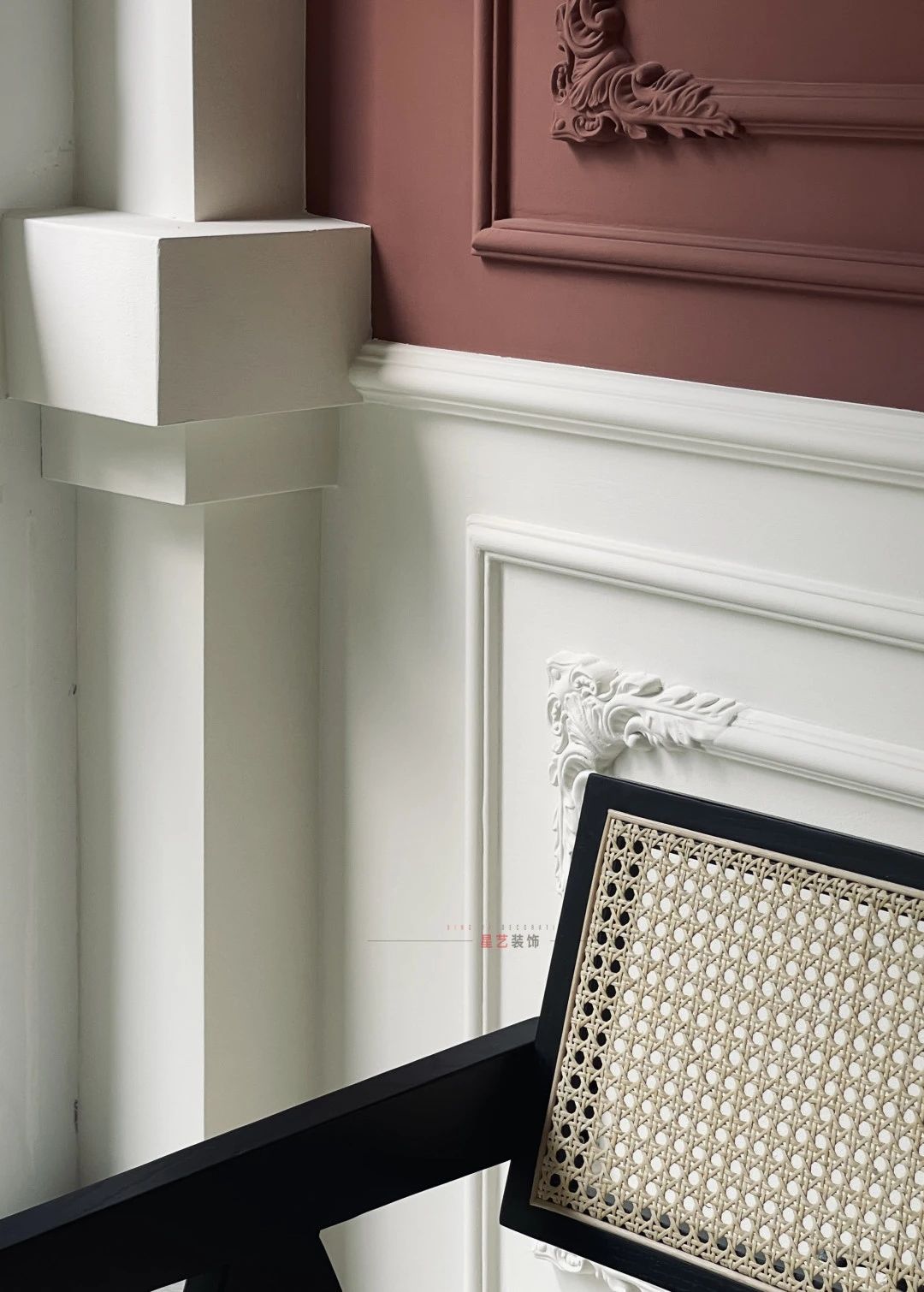 提到法式風格,就繞不開石膏線條元素,大開大放、如火如荼的大繎色塊游走整個客餐區,毫不遮掩展示了主人熱情的性格,同時達到了延伸、整合的作用。