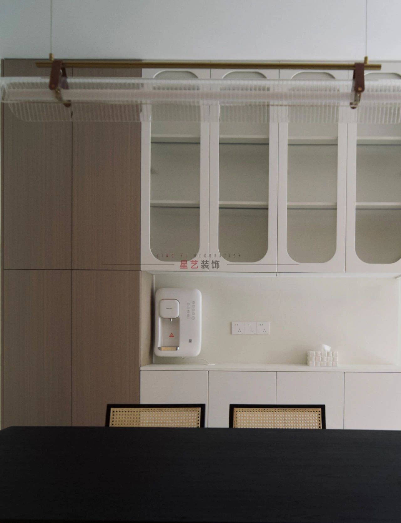 餐桌旁幾乎一整面墻的儲物柜,純白色弱化了存在感,中間留了開放格,可以放小型的咖啡機和常用物品。